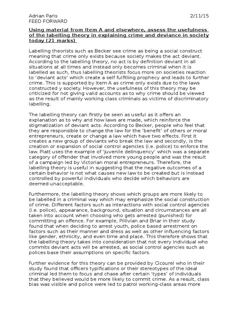 Before the onset of the labelling theory, many a criminologists defined crime as the behaviour that was contrary to the criminal laws established by the government. However, in the late 20th century, the labelling theorists came up and influenced the jurisprudence of the deviance essay justice systems. Therefore, in this discussion, the paper shall look at how and why state intervention, labelling persons as criminals and societal reactions actually lead to unintended consequences to the Read more Social Issues Justice Deviance Supreme Court Criminal Justice Crime Society Law Theory Belief Behavior Murder 2 Pages Management Questions Essays Examples 1.